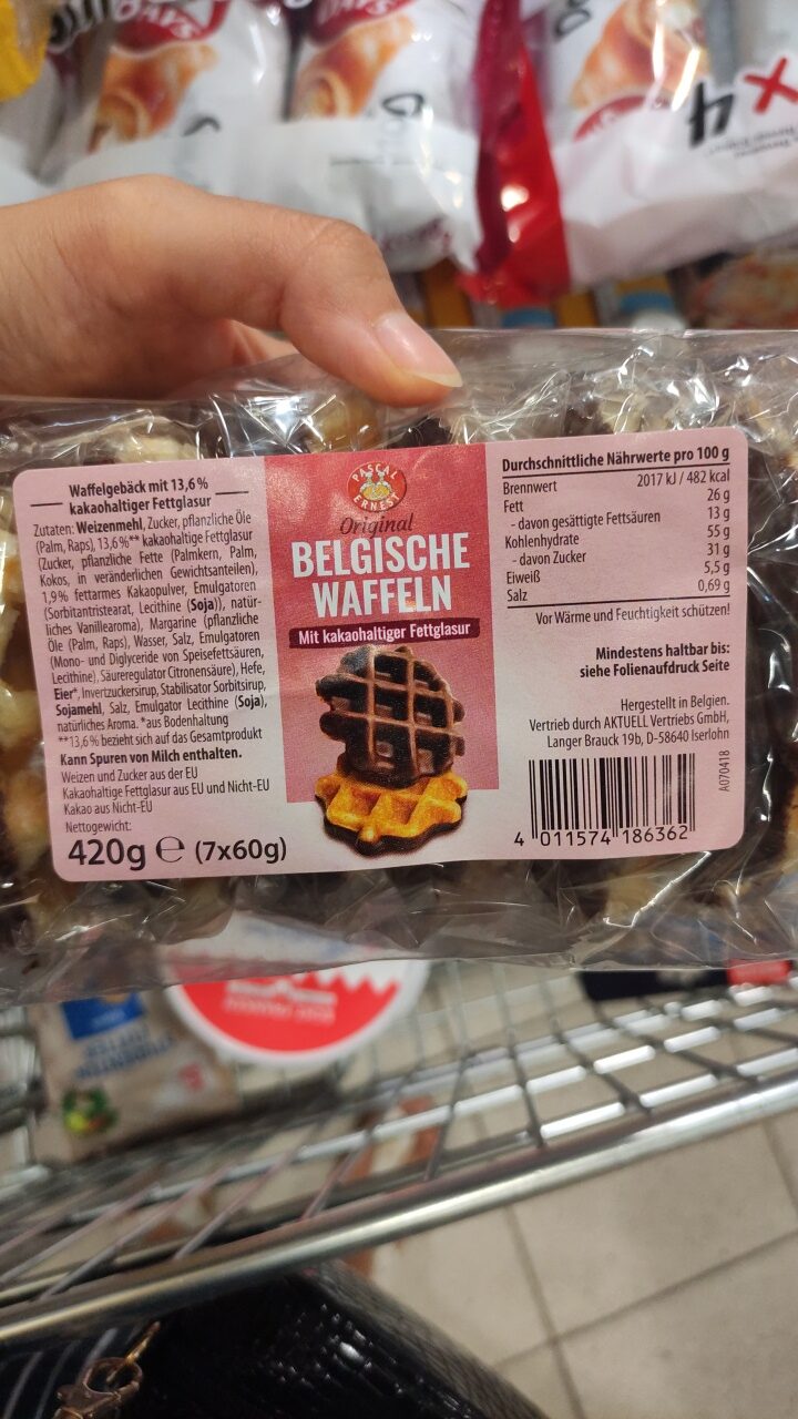 📄 Certificates: With Cocoa Containing Fat Glaze, Nutritional Values Per 100 G, Best Before: See Film Imprint Side, Made In Belgium, Distributed By Aktuell Vertriebs Gmbh, Langer Brauck 19B, D 58640 Iserlohn, Contains Traces Of Milk, Wheat And Sugar From The Eu, Cocoa Containing Fat Glaze From Eu And Non Eu, Cocoa From Non Eu, Net Weight: 420G (7X60G)