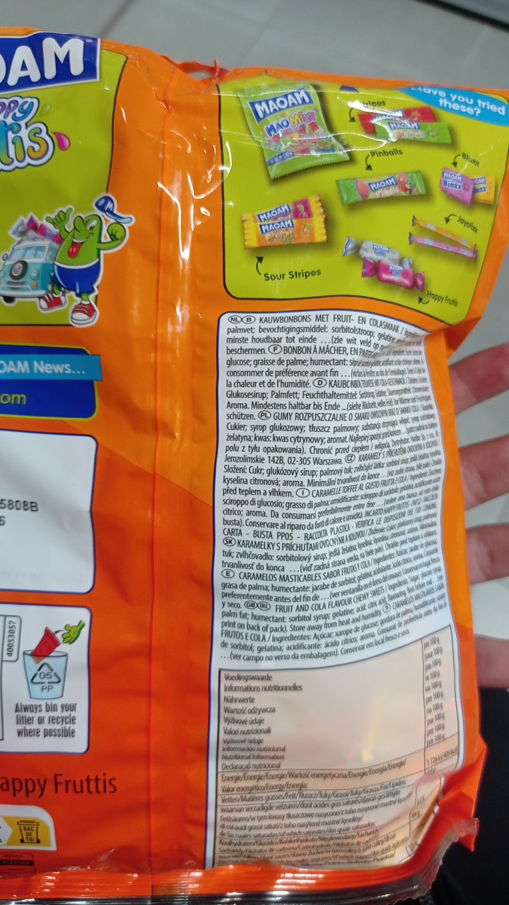 📄 Certificates: Kauwbonbons With Fruit And Cola Flavor, Bonbon To Chew, In Part, Gum Dissolves On The Tongue Or Flavor And Taste Of, Caramel Toffee With Fruit And Cola Flavor, Caramels With Fruity And Cola Flavors, Fruit And Cola Flavor Chewy Sweets, Always Bin Your Litter Or Recycle Where Possible