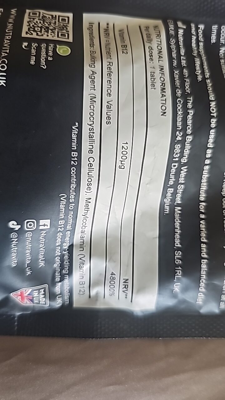 📄 Certificates: Food Supplements Should Not Be Used As A Substitute For A Varied And Balanced Diet And Healthy Lifestyle., Nutravita Ltd. 4Th Floor, The Pearce Building, West Street, Maidenhead, Sl6 1Rl, Uk., Eu/Ue: Sylphar Nv. Xavier De Cocklaan 24, 9831 Deurle, Belgium., Nutritional Information, Per Daily Dose: 1 Tablet, **Nrv = Nutrient Reference Values, *Vitamin B12 Contributes To Normal Energy Yielding Metabolism., (Vitamin B12 Does Not Originate From Uk.), Made In Uk, Have A Question?, Scan Me, @Nutravita_Uk, @Nutravita, Nutravitauk, Www.Nutravita.Co.Uk
