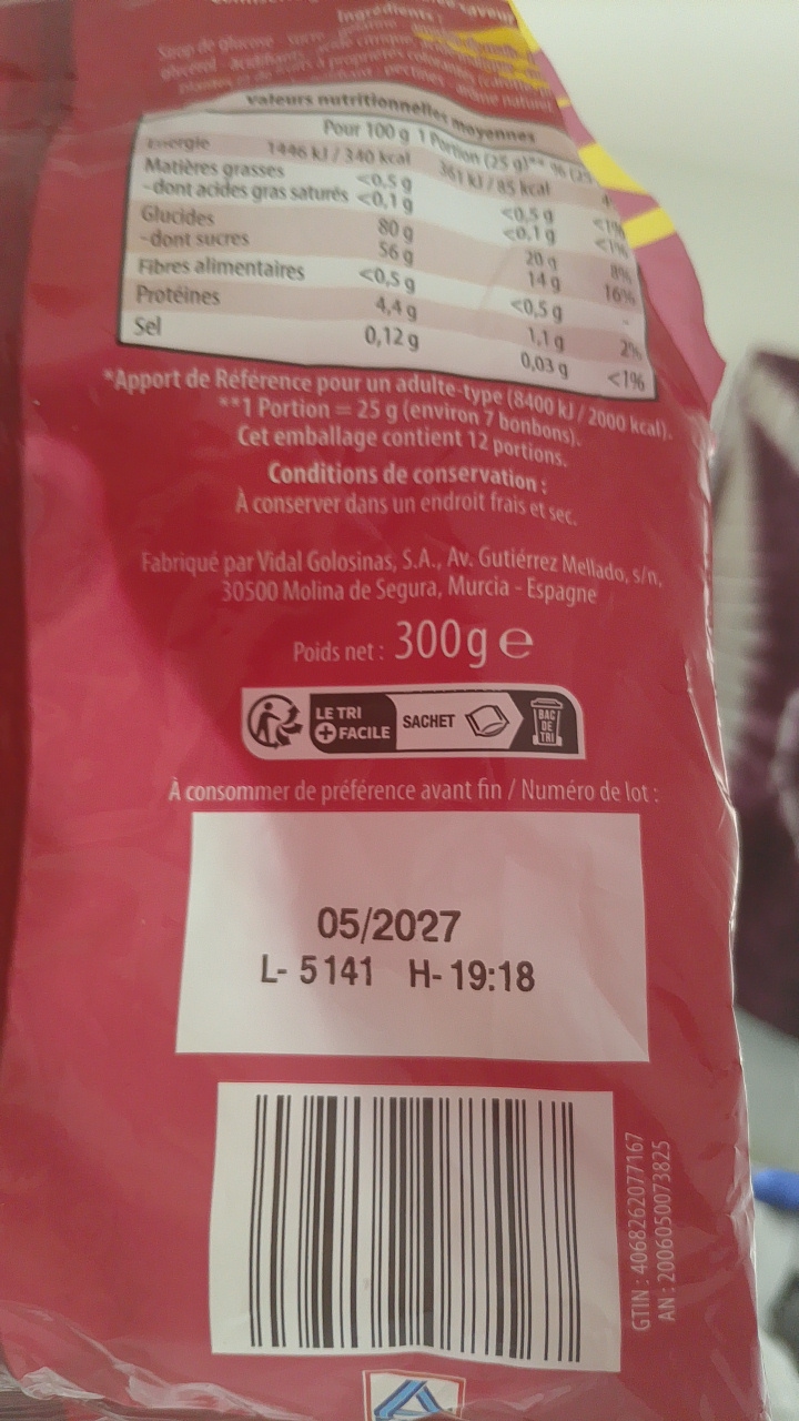 📄 Certificates: For Adults, This Package Contains 12 Portions, Conditions Of Preservation: To Be Stored In A Cool And Dry Place, Made By Vidal Golosinas, S.A., Av. Gutiérrez Mellado, S/N, 30500 Molina De Segura, Murcia Spain, Net Weight: 300 G E, Best Before Date / Lot Number, Gtin: 4068262077167, An: 2006050073825